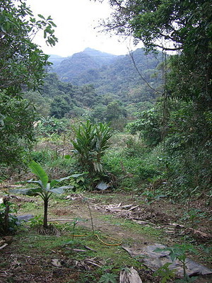 今天是第二次到訪,迎面先是幾棵香蕉樹,有兩棵已掛著大串的小蕉,再來一棵挺眼熟的植物,母親說是「桃子」,然後幾株芋頭,繞過已破爛不堪的農舍,十來棵甘蔗東倒西歪,靠溪邊爬了許多地瓜葉,然後一小片空地疏疏落落長了幾棵一二米高的植物,很好辨認,因為其中一棵掛了一顆檸檬。