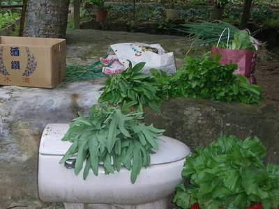 上週日去老爸的山田時,二伯家的三堂哥和堂嫂也在,他們借地種菜,位在狹長山田的頂端,還搭了一間工寮當休息室,門口的大岩石上堆了許多剛採收的菜,石頭旁還有個馬桶,據說他還想蓋間廁所,被二哥阻止了。