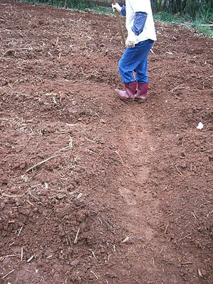 最累的工作是搓土,因為希望蓋住種子的土不要太厚太重,影響到發芽的狀況,所以我戴著塑膠手套,隨手抓土塊在手裡搓細。前幾天都下雨,因此有的土塊很黏,搓不出細土粒時就要重來。挖洞和搓土時,我都隨身夾著小凳子,一邊移動一邊做工,凳子很矮,於是兩條大腿在畦溝之間顯得多餘,最後就變成一隻腳彎曲,另一隻腳橫向伸向側面,然後站起來移動位置再蹲坐。