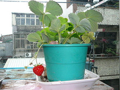 一月時社大菜園班的學長送我們一些草莓苗,我分種在兩個長條花盆和兩個小盆中,長條盆帶去農場丟在地上「露天放養」,二、三月大約採收過三、四回。http://tw.myblog.yahoo.com/cloudtree-naturalfarm/article?mid=516#1207