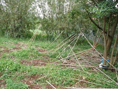颱風給農場帶來怎樣的災情?迎面是豆棚竹竿倒了一地。原來走道右邊這裡有四座竹搭的架子,全部倒了。竹竿壓在菜畦上,有一畦種綠豆,被壓傷不少,另一畦種紅豆,也有損傷。