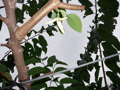 我們各拿一隻畫水彩的毛筆,羅傑說用毛筆的效果比用「授粉鎗」好,因為授粉若不完全,容易長成「畸型果」,傳統用毛筆的方式比較能掌握。首先是仰頭找到果樹枝掗間的青綠色小花,尤其是三或四瓣全張開的花朵,然後拿毛筆去頂住花蕊,輕輕轉動,就會把花粉頂落在毛筆上。