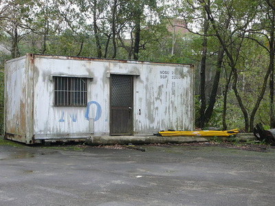 但我們馬上面臨一個難題:怎麼移動它?還好有「小伍姐夫」在場,告知我們請200型的怪手,就可以將此貨櫃屋懸吊起來,再慢慢移到我們的地界裡。我們還擔心它會不會太老舊,吊起來的同時就散了?然後才發現這可是個鋁櫃,比一般的鐵櫃更耐用。
