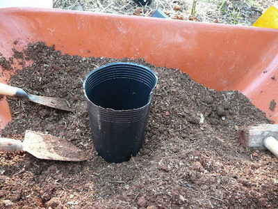 於是整個下午,我們在甲地樹林以獨輪車當攪拌槽,一點點泥土(放在苗盆裡,希望樹苗先接觸一下本地的土質),但要先敲碎(因為硬得要用榔頭來敲),其他都是有機質土。