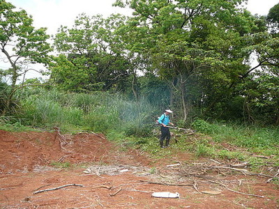 第一次是 五月八日 ,貓爸一到農地,就指著廣場後方的斜坡上,認為那一片芒草叢影響景觀,人在廣場上視野受限。等他把遮陽帳蓬搭好,就背起割草機開工去了。