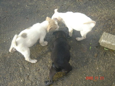 放小小狗出籠再餵食,牠們已經迫不急待地圍著小鐵鍋搶食,這才發現牠們的肚子怎麼變得那麼圓?昨晚因為從母親家回來,帶回兩包煮熟的雞肝,所以連續餵小小狗吃了兩頓。(也因為小葉餵食其他狗總是一隻一隻的拌料,餵食時間長,小小狗一直聽到鍋子聲,所以好像吃不飽似的猛叫個不停,於是我又補一小鍋雞肝給牠們吃。)但是眼睜睜看著牠們吃完飯不久,立刻在周圍大便,而便便中卻有白色的小蟲蠕動,這下可糟糕了,小小狗的肚子裡有寄生蟲,難怪怎麼吃都吃不飽。