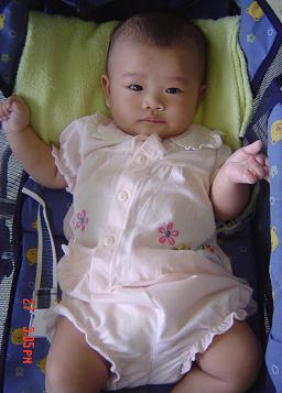 給蛋糕穿上新式樣的粉色系套裝,看起來好可愛,搭捷運時,我忍不住幫她拍照.這些衣服再過陣子她就穿不下了.