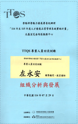 2025 07 29 左永安 顧問/講師/委員/宮主/秘書長/永續長/執行長/理事長 114年至115年人才發展品質管理系統 實施計畫 TTQS 三類專業人員回流訓 組織分析與發展 ...