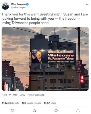 蓬佩奧與夫人、幕僚將於台灣時間今晚7點50分抵達桃園國際機場,在台灣停留到3月5日,他出發前也看到了看板,特別在推特發文直呼:「感謝這個溫暖的看板!夫人蘇珊和我期待見到你們─熱愛自由的台灣人!」