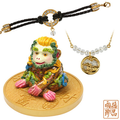 搭配「十二生肖守護神招財墜鍊套組(猴)」,本套組含生肖項鍊及手鍊,鍊墜為金色生肖圖騰,搭配無數晶鑽組成,閃亮耀眼又別緻!在圓形鍊墜背面特以浮雕刻製各生肖之守護神圖形,經常佩戴如神佛隨身守護,並為您強化各方運勢;更可守護事業蒸蒸日上,為您帶來吉運百分百!
