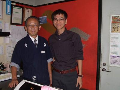 吃過晚餐。下樓。樓下賣很多物品。反正還在等,我與和藹可親的店長來張合照。