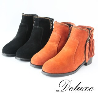 服務這麼優,當然在網路購物最好啦~~你一定要來看看【Deluxe】短跟流蘇短靴(拉鍊流線設計 黑-橘)~~