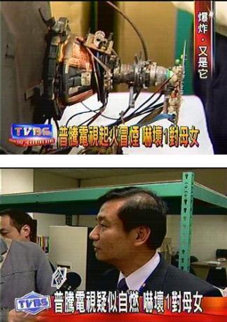 2004/3/25台北縣瑞芳鎮,1對母女晚上打開電視,半個小時後,電視機突然起火燃燒,嚇得這對母女趕緊滅火,還好沒有釀成火災。普騰電視表示,這款電視,是88年7月製造的。