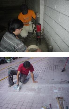 早早到了辦公室,老沈師徒今天要來做地下室停車場的抓漏,久候洗洞配合商家未到,於是先把後棟宮廟前已經凸起,尚未被踩碎的瓷磚修補起來,據說老爺爺已經來看過了,我以為是他要老沈施作的,因為這一部份並未評估在此次抓漏工程內。