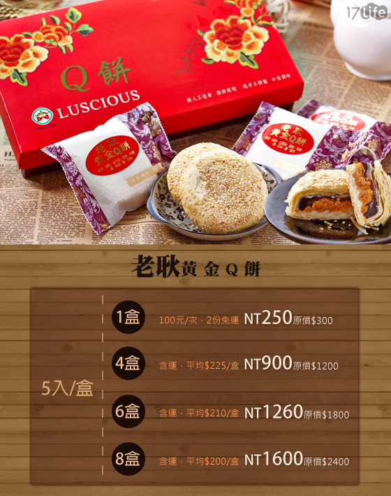 商品訊息簡述: 宅配:平均每盒最低只要200元起(2盒免運)即可購得【老耿】黃金Q餅1盒/4盒/6盒/8盒(5入/盒)。
