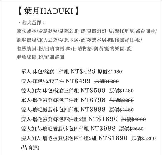 宅配台灣製造最安心!經磨毛處理,布料柔滑質感超優!童話夢遊、趣味農場、動物樂園等多款圖案,陪你睡個好覺商品訊息簡述: 只要429元起(含運)即可購得【葉月HADUKI】原價最高5360元床包/被套系列:(A)單人-床包/枕套二件組/(B)雙人-床包/枕套三件組/(C)雙人加大-床包/枕套三件組/(D)單人-磨毛被套/床包三件組/(E)雙人-磨毛被套/床包孕馦捸G1組/2組/(F)雙人加大-磨毛被套/床包孕馦捸G1組/2組,共有多種款式花色可選擇。