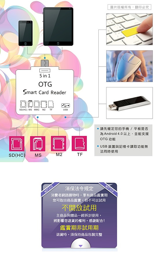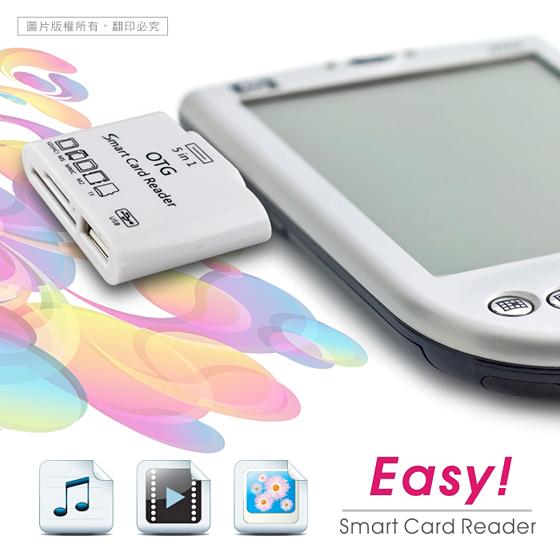 那麼,什麼是OGT五合一讀卡機呢?全名USB On-The-Go(簡稱USB OTG)是近年來很夯的一項技術;它可以讓支援OTG的手機,透過USB OTG的專用線材,來讀取隨身碟,對於智慧型手機使用者,不管是在工作上還是生活上,都非常方便!