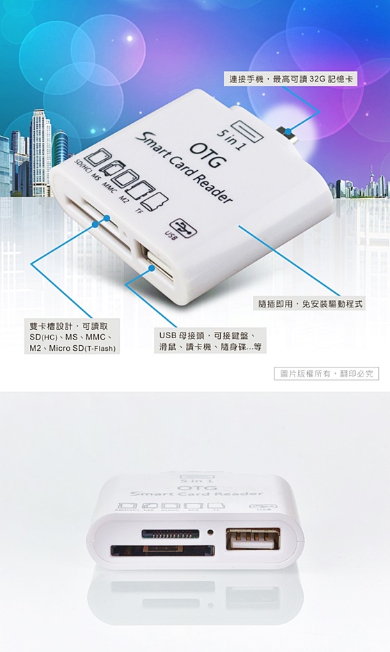 ●五合一讀卡器,支持智能手機直接讀取大容量SD(HC)/MS/M2/MMC/TF存儲卡及隨身碟。