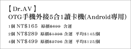商品訊息簡述: 平均每個最低只要125元起(含運)即可購得【Dr.AV】OTG手機外接5合1讀卡機(Android專用)1個/2個/4個。