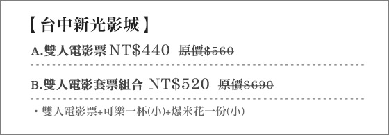 商品訊息簡述: 只要440元起(雙人價)即可兌換【台中新光影城】原價最高690元:(A)雙人電影票/(B)雙人電影套票組合:雙人電影票+可樂一杯(小)+爆米花一份(小)。