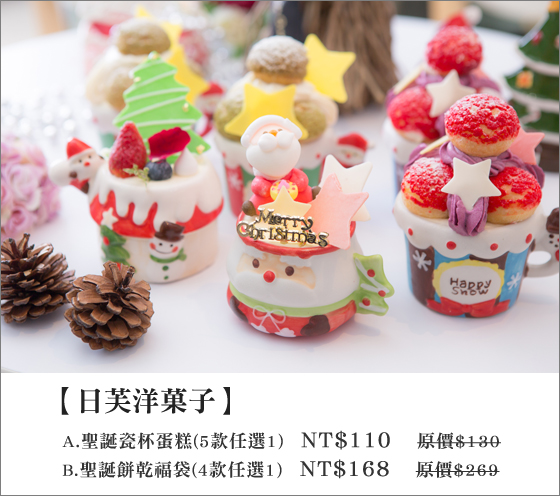 商品訊息簡述: 店取:只要110元起即可帶走【日芙洋?子】原價最高269元聖誕限定方案:(A)聖誕瓷杯蛋?5款任選1)/(B)聖誕餅乾福袋(4款任選1)。
