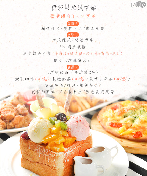 商品訊息簡述: 只要749元(3人價)即可享用【伊莎貝拉風情館】原價1726元豪華組合3人分享餐:鮪魚沙拉/優格水果/田園蘆筍(3選3)+南瓜蔬菜/奶油巧達(2選3)+8吋總匯披薩+美式綜合拼盤(炸雞塊+鱈魚條+起司條+薯條+脆片)+甜心冰淇淋寶盒x1+煉乳咖啡/貝拉奶茶/風情水果茶/草莓牛奶/啤酒/螺絲起子/伏特加萊姆/特古拉日出/藍色夏威夷等(9選3,酒精飲品至多選擇2杯)。