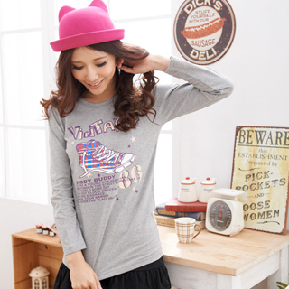 momo購物-【S-7L熊衣褲語】帆布鞋印圖長袖圓領棉T F54(黑、灰S-2L)