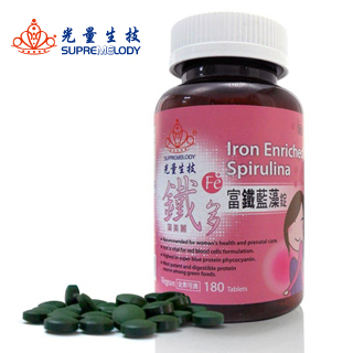 富鐵藍藻(螺旋藻),營養價值非常豐富,除了擁有植物性蛋白質、類胡蘿蔔素及藻青蛋白之外,更含有豐富的鐵(Fe),鐵是構成血紅素與肌紅素的重要成份。鐵有助於正常紅血球的形成,有助於氧氣的輸送與利用。食用富含鐵的藍藻,可以促進新陳代謝、調節生理機能、養顏美容、健康維持,最適合女性、素食者及青少年長期食用的營養補給。