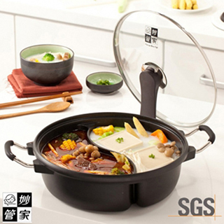 一鍋二味,雙重享受,麻辣鴛鴦鍋在家立刻煮,火鍋圍爐最佳選擇!◆鍋內採用不沾塗層,使用上方便又好清洗 ◆透明鋼化玻璃鍋蓋,專利防溢洩壓技術,可直立放置,不佔空間◆鍋身厚實為鋁合金壓鑄而成,鍋底為特殊處理層,可增加導熱的速度 ◆鍋蓋長把手的設計可方便掀蓋,不易被冒出的熱氣燙傷,還可站立於桌面上◆此產品不適用於電磁爐,微波爐