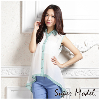 【名模衣櫃】透膚撞色雪紡無袖上衣(白)商品訊息描述:
