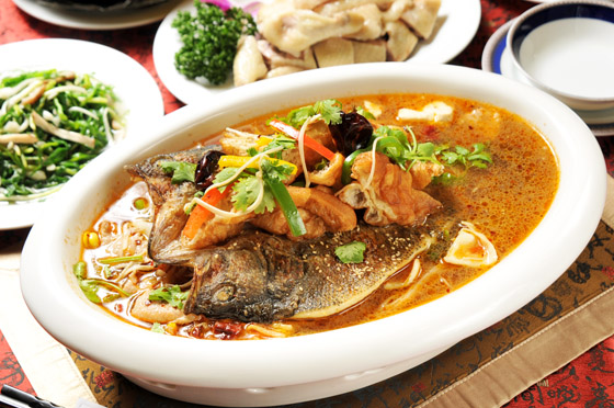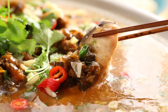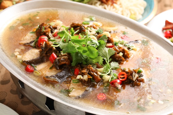 珍貴大尾的鱘龍魚以清蒸的方式入菜,更能突顯魚肉的細緻綿密和鮮甜的滋味,其清蒸的湯汁用來拌飯更是美味。