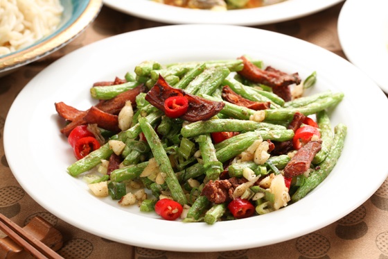 肥腸經處理乾淨後,沾裹上少許的太白粉下鍋油炸,再以蒜末、辣椒爆香提增香氣,搭配四季豆,咬勁中還帶有清脆口感,堪稱家常料理中的人氣王!
