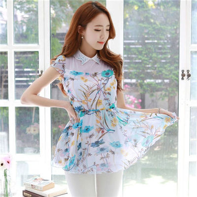推薦東森購物網【MINI菟絲花】時尚燙鑽翻領噴繪印花雪紡顯瘦A擺小衫上衣-現貨+預購