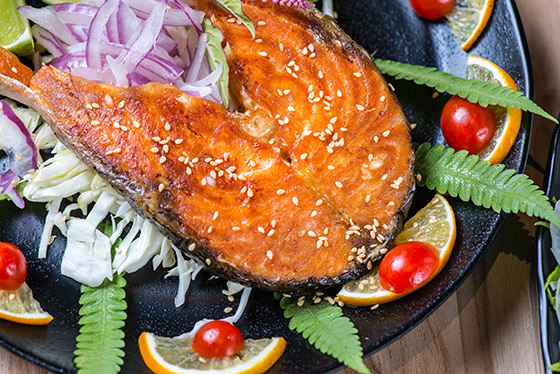 外皮烤得香酥的鮭魚,濃郁的新鮮海味撲鼻而來,鹹香回甘又清爽,纖細魚肉細細咀嚼後,更吃出自然甜味。