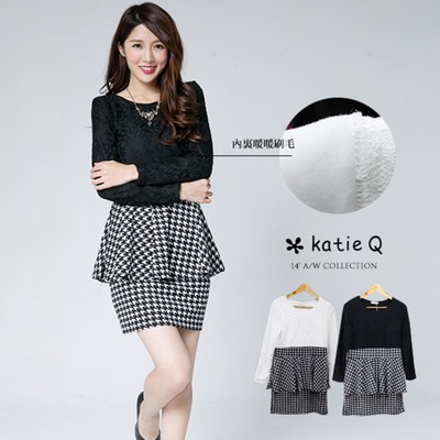 【-Katie Q-快速出貨】千鳥格刷毛內裡百褶裙洋裝M-2L(黑-白)