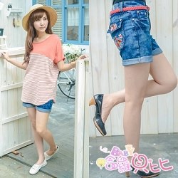 【哈囉貝比】 紅色編織皮帶紅黃米字銀線個性牛仔短褲,珍珠粉 心得