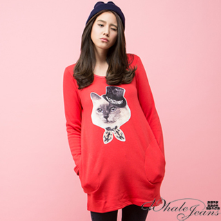 【WHALE JEANS】沉穩可愛戴帽領巾貓咪圖案長版T恤尺碼S(2色)