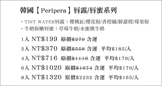 商品訊息簡述: 平均每入最低只要165元起(含運)即可購得韓國【Peripera】唇露/唇蜜鞋墊貼系列1入/2入/4入/6入/8入:(A)TINT WATER唇露:櫻桃紅/櫻花粉/香橙橘/鮮甜橙/莓果粉/(B)牛奶粉嫩唇蜜:草莓牛奶/水蜜桃牛奶。