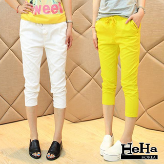 momo購物網-【HeHa】韓版糖果色彈力腰圍鉛筆褲七分褲(二色)