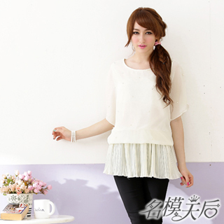 【名模天后】快速到貨唯愛-鬆緊收腰百摺下擺珍珠雪紡上衣(米白)
