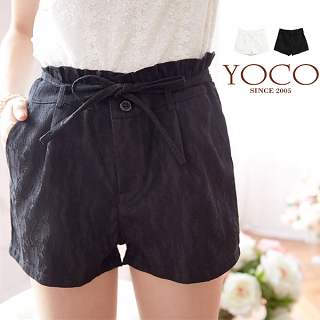 推薦momo流行服飾【YOCO】花邊綁繩蕾絲壓紋短褲-S.M.L