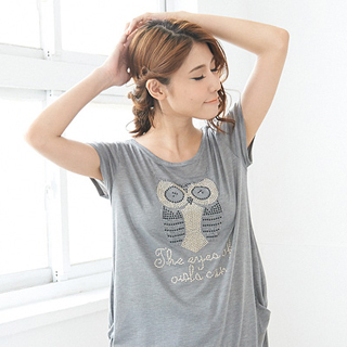 推薦momo流行服飾【S-7L熊衣褲語】貓頭鷹貼鑽造型側邊抓皺圓領蝴蝶袖上衣U291(灰、藍S-2L)