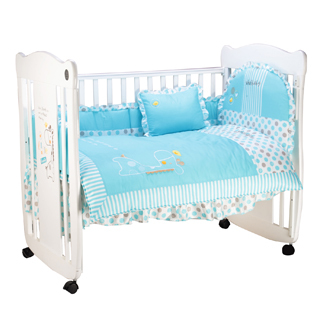 momo購物台,momo購物網:【VIVIBABY】長頸鹿嬰兒床+七件組寢具組(藍-粉)