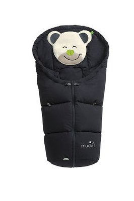cute Mucki bear's face. Both young and old will fall in love with the cuddly teddy immediately. A reflective transfer print provides maximum visibility which makes the footmuff safe for travel and essential for strolling through the dark.