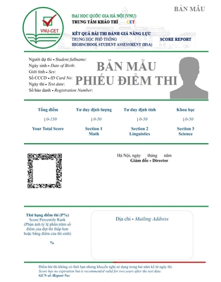 Kỳ thi ĐGNL ĐHQG Hà Nội được thực hiện hoàn toàn trên máy tính. Vì vậy sau khi thí sinh kết thúc bài thi sẽ có ngay kết quả. Thí sinh chỉ cần chờ trong một thời gian ngắn là có thể nhận được điểm số của mình. Dưới đây là mẫu phiếu điểm thi của các thí sinh: