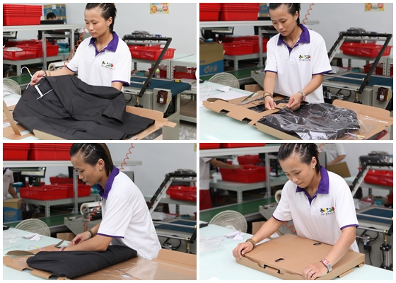 工廠中使用自動化流程的處理方式,將整燙完成衣物,再一一分配指定包裝區。