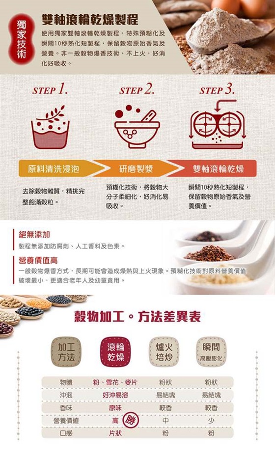 ●雙軸滾輪10秒瞬間熟化乾燥技術,保留穀物原味與營養