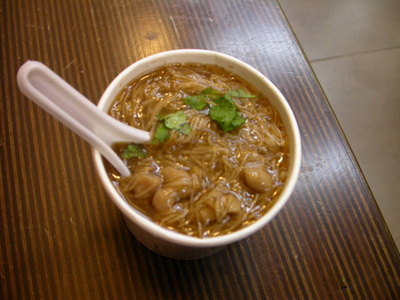 士林夜市阿宗麵線有座位坐,還有大大的液晶電視可欣賞節目,但沒有桌子,得端著碗吃,麵線裡主要的配料是大腸,並且吃...