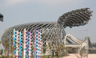 世運主場館位於高市左營中海路,鄰近捷運紅線R17站,基地面積約十九公頃,工程造價五十億,擁有四萬個座席、一萬五...
