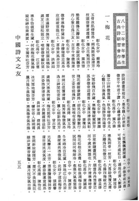 學生幫我工讀找<詩文之友>上資料竟然看到我高中時的詩原來那是我以前高一寒假參加彰化縣詩學研究協會辦的古典詩研習營時所寫的練習詩作也是我的第1-3首古典詩我一直以為這些詩要登也是登在<臺灣擊缽吟>上想不...